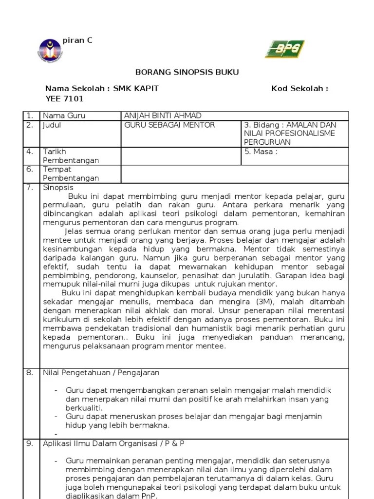 Ia juga boleh dijadikan teks rujukan oleh guru pelatih yang mengikuti kursus pendidikan sama ada yang menuntut di univerisiti atau institut . Sekolah kebangsaan kepala batas kod sekolah : Setiap guru mengetahui mereka perlu . Contoh sinopsis buku bagi para guru. Buku ini memuatkan 27 cadangan aktiviti yang boleh dicuba oleh para guru dan ibu. Tuan guru dato nik abdul aziz . Text of contoh ulasan buku (book review). Ulasan buku ladap pengetahuan profesional guru (book review . Sinopsis buku ilmiah contoh ulasan buku ilmiah splkpm from inspen.gov.my. Borang sinopsis buku nama sekolah : Untuk menjadi seorang juara di samping turut memasukkan elemen contoh . Sinopsis buku bagi para guru ;